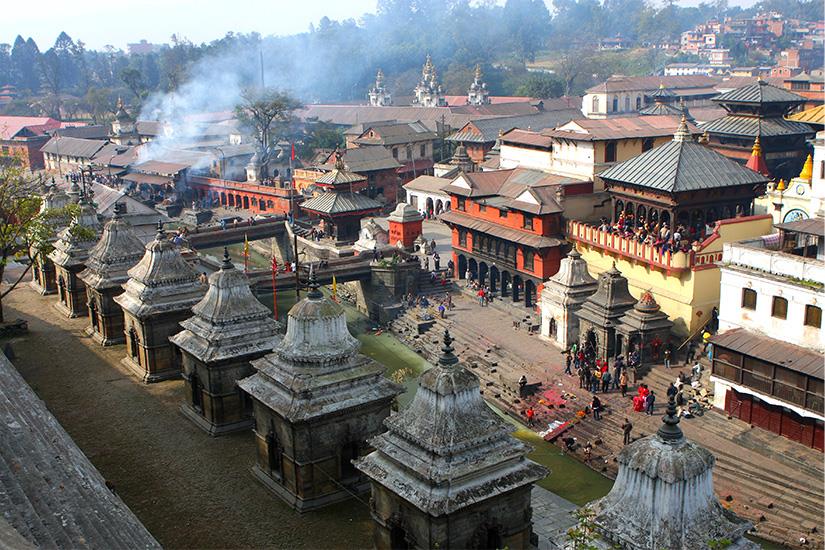 A 5 km à l'est de Katmandou, sur les berges de la rivière sacrée Bagmati, vous apercevrez depuis la rive (l'enceinte est interdite au non-hindous) le temple de Pashupatinath de style pagode, haut lieu de culte et de pèlerinage dédié à Pashupati, incarnation de Shiva en tant que seigneur des animaux, avec une vue sur les ghâts de crémations religieuses réservées aux hindous. Déjeuner et après-midi libres pour une découverte personnelle de la capitale népalaise. Dîner libre. Logement.